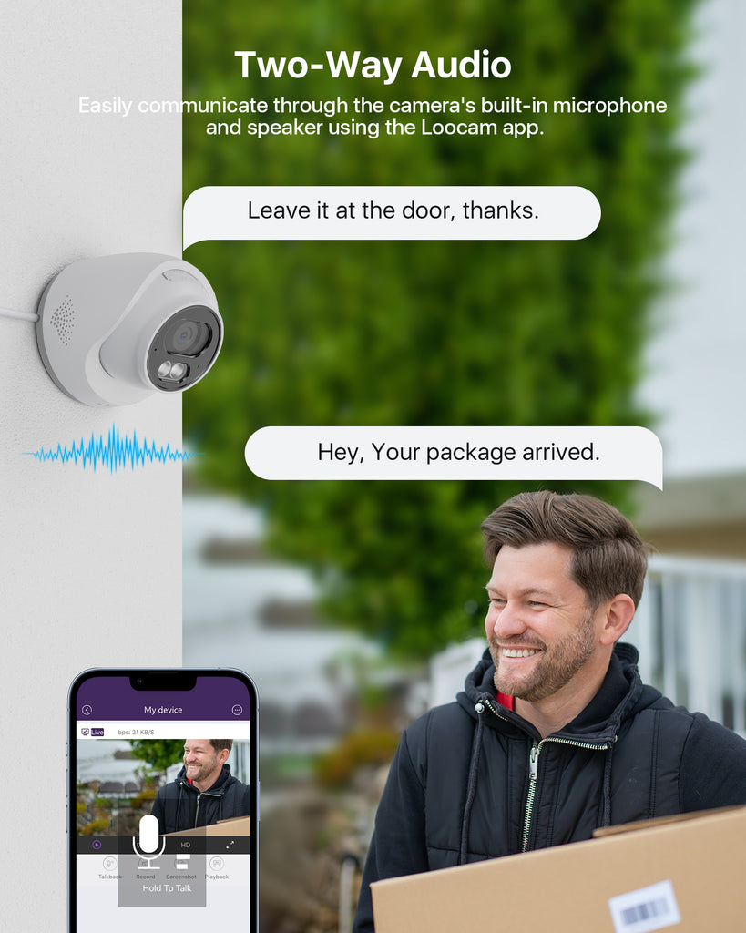 - Two-Way Audio: Listen and speak to live audio with the built-in microphone and speaker, adding an extra layer of awareness.