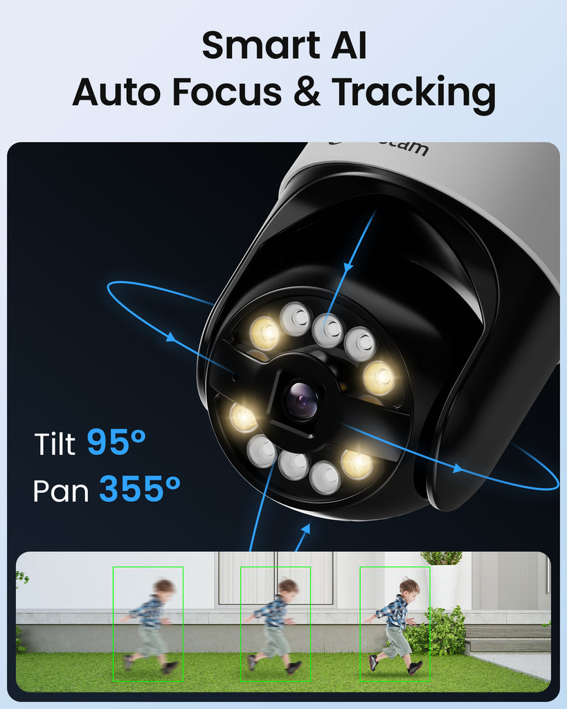 - Smart AI Auto Tracking and Wide Angle: 355° pan and 95° tilt cameras outdoor automatically track intruders and follow people on the move so you don't miss any noteworthy events. Allows you to capture richer details in wide angle, ensuring a longer and wider full view to keep your home and business property safer.
