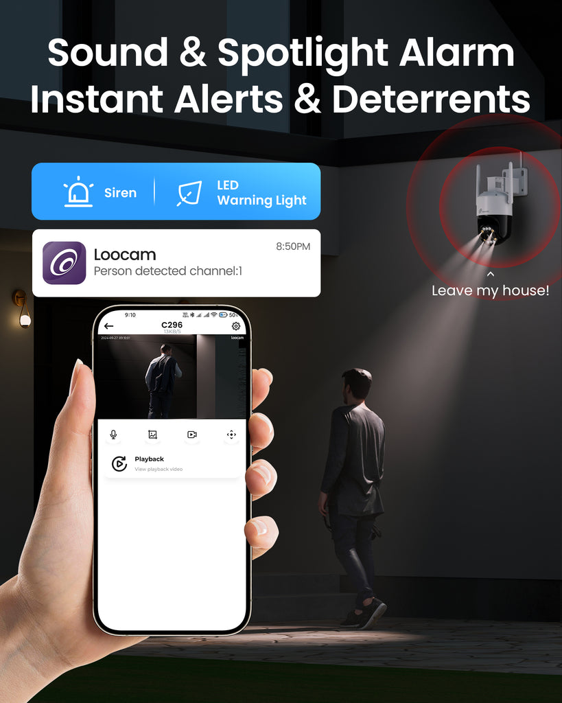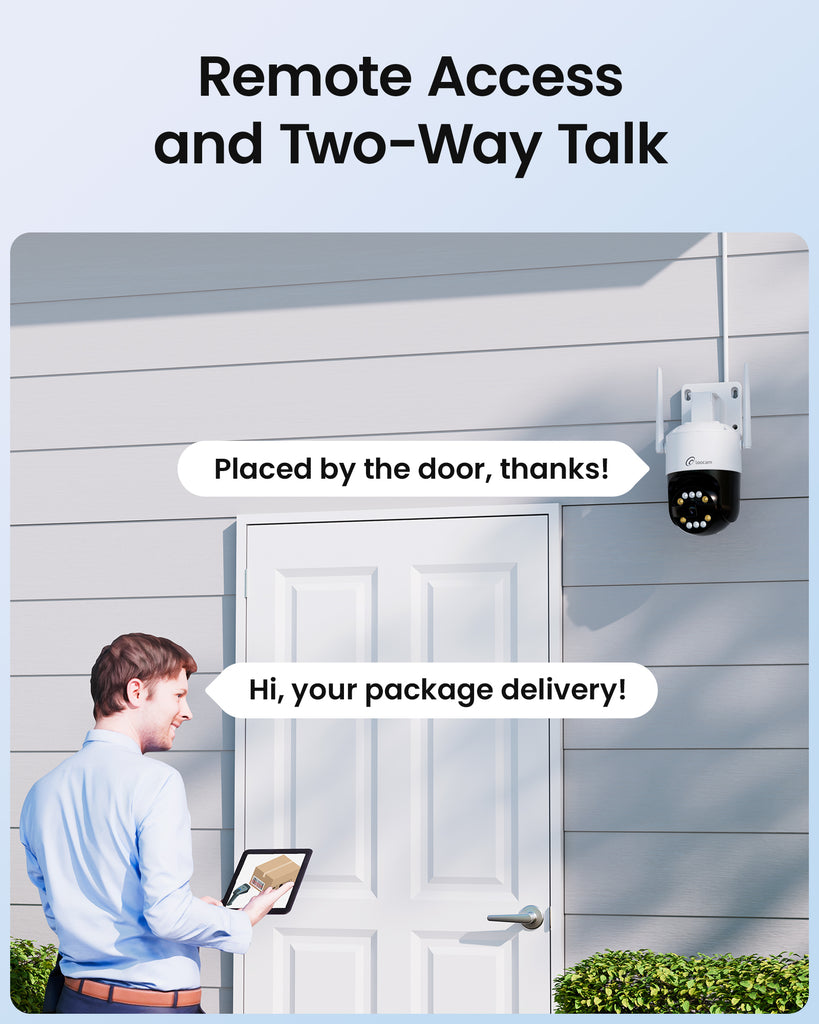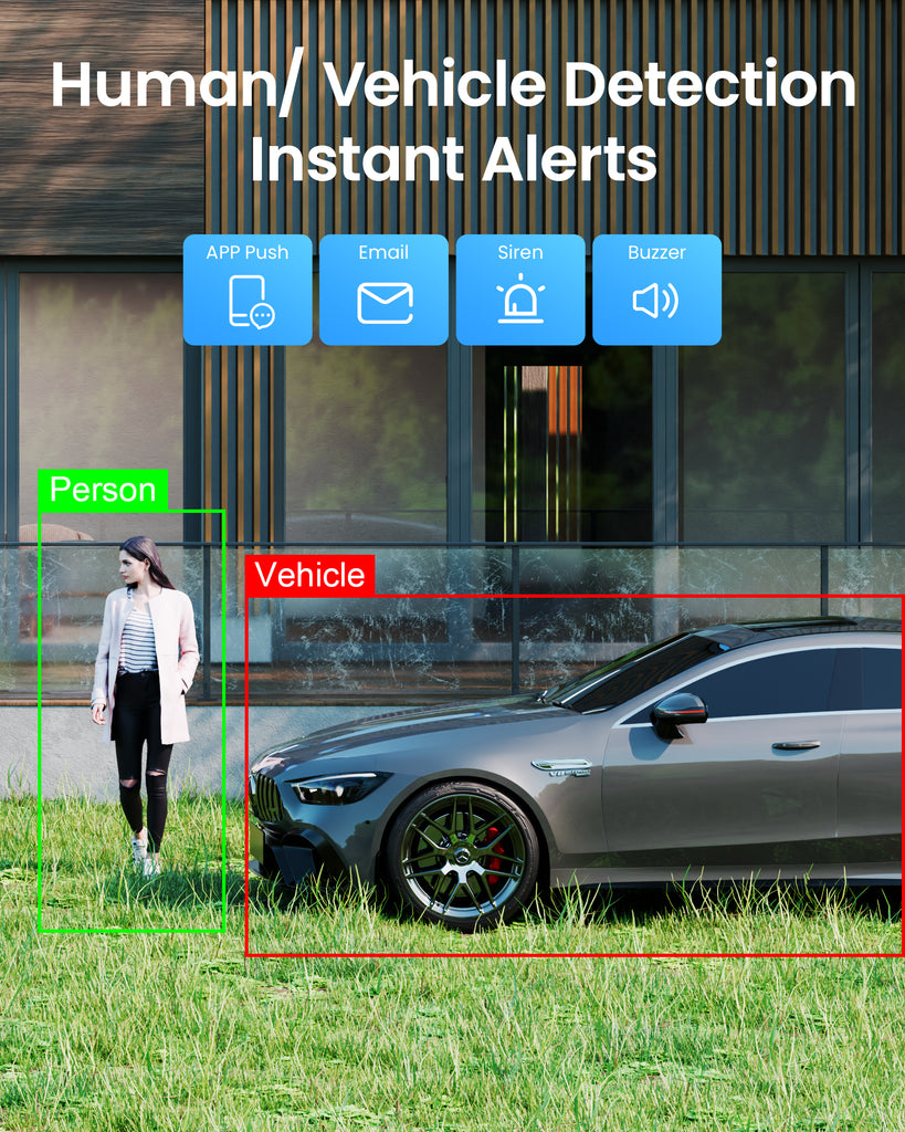 - Instant Siren & Spotlight Alerts and Two-Way Talk: Accurately detects people/vehicles, reduces false alarms due to animals or shadows, and triggers siren and spotlight alarms, APP notification alerts to ensure a quick response to real threats. What's more, the two-way audio feature allows you to communicate remotely, greeting visitors or warning of intruders.