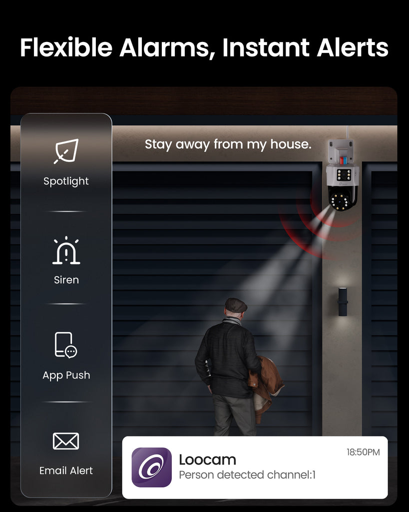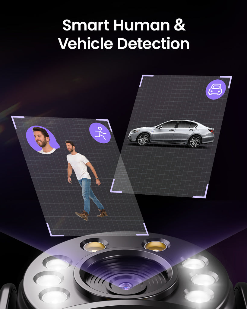 Smart AI detection and instant alerts: AI-powered detection accurately identifies people and vehicles to reduce false alarms. The surveillance camera system activates a siren and spotlight on motion detection and sends real-time alerts to your phone.