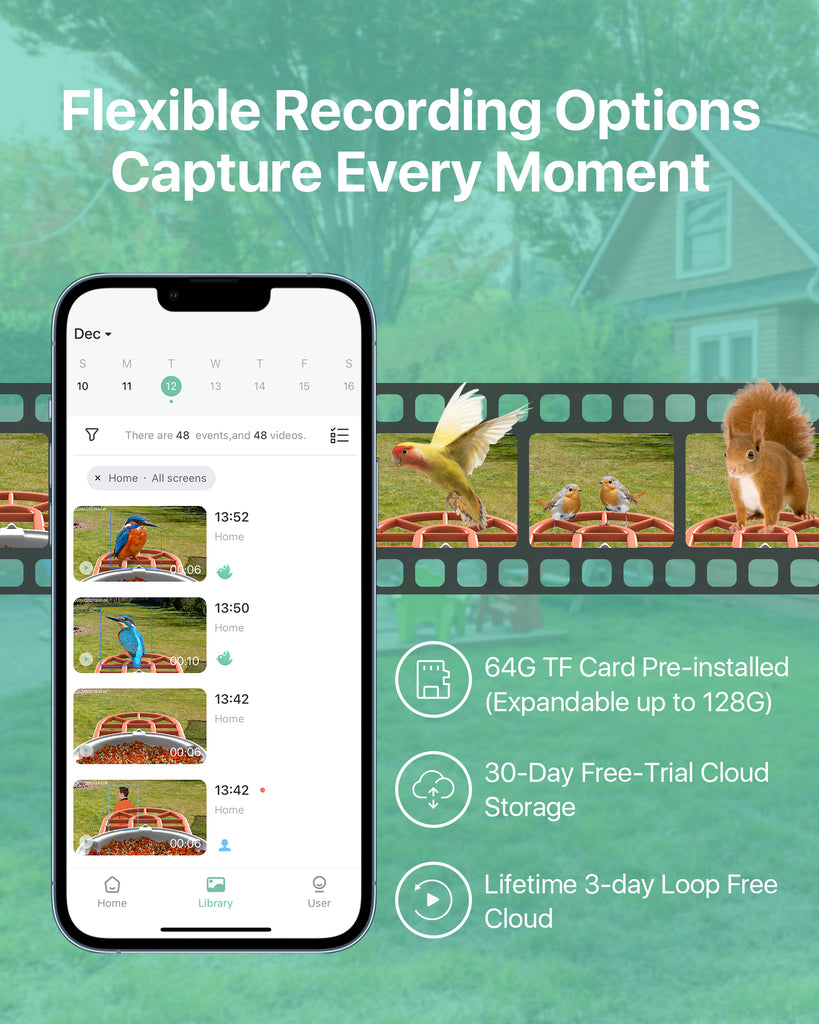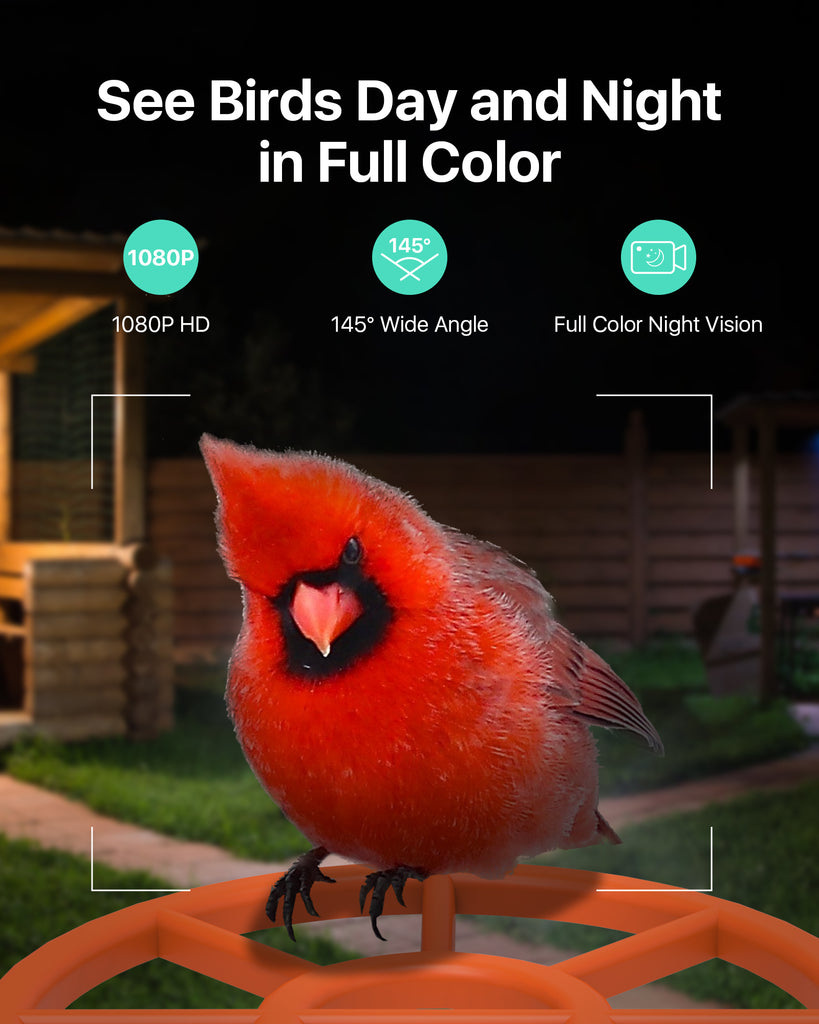 - 【1080P Color Night Vision & 64GB Local Storage】Experience crystal-clear bird watching with 1080P HD smart bird feeder camera and 145-degree wide viewing angle. Captures close-up details and enjoy clear and colorful night vision for round-the-clock observation. Equipped with a built-in 64GB Local Storage(Maximum up to 128G), it's easy to store your captured moments for sharing. Never miss a beat of your backyard birdwatching adventure.
