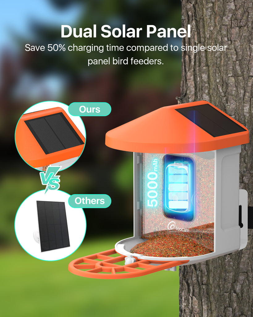 - 【Efficient and Eco-Friendly Integrated Solar Panel】Experience hassle-free operation with video camera bird feeder's integrated solar panel design. With a built-in 5000mAh low-power battery and integrated dual solar panels, enjoy uninterrupted operation for up to 6 months on standby under normal conditions(recording 20 10s videos every day). Say goodbye to frequent charging and hello to a cost-effective and environmentally friendly power solution for your birdwatching needs.
