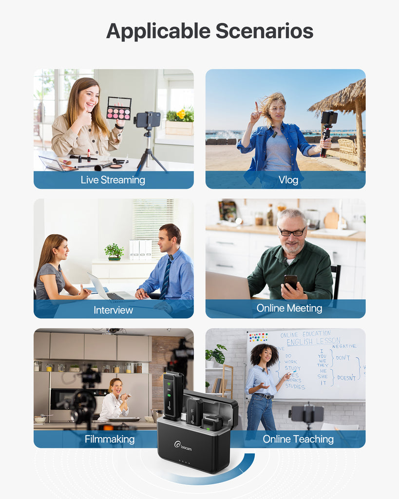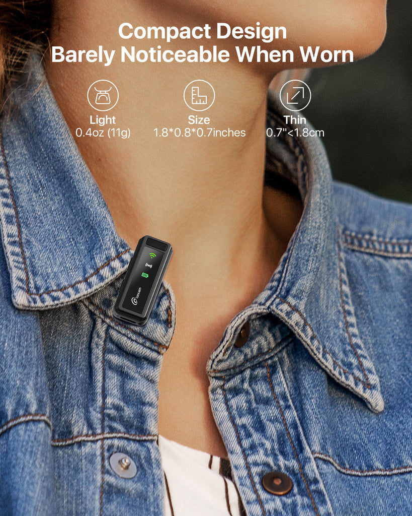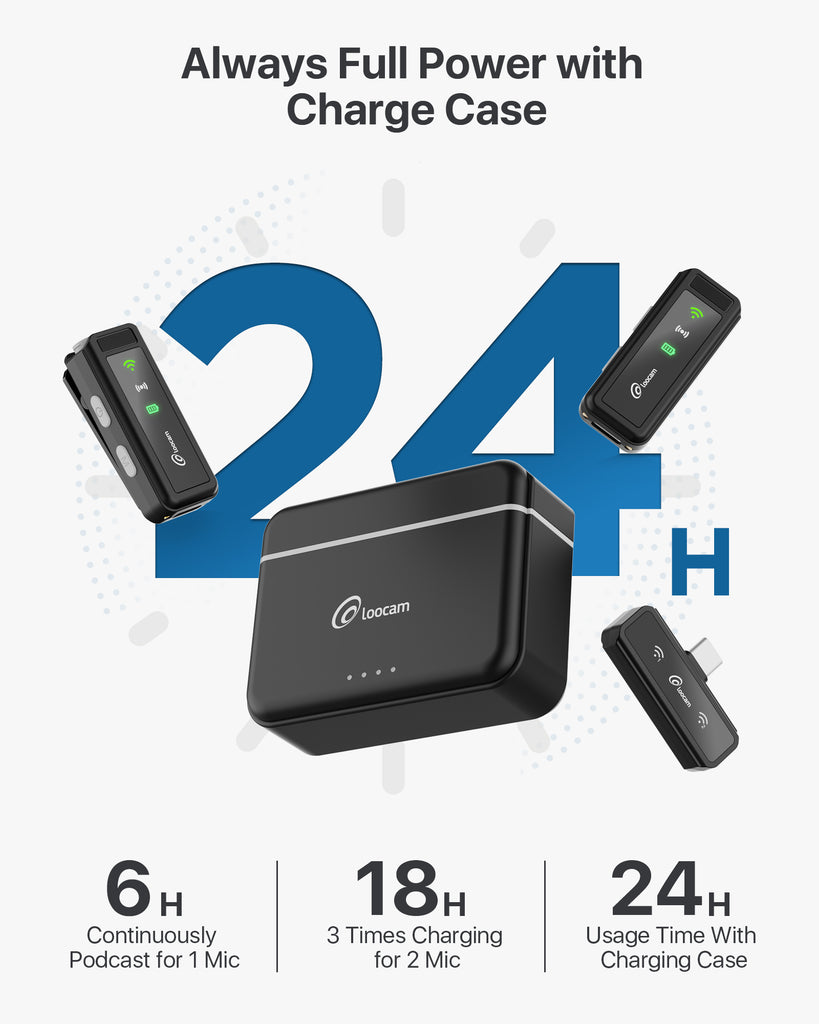 - 24H Standby, Record While Charging: Got a long day of podcasting or vlogging ahead? No worries! Loocam clip on microphone lasts up to 6 hours on a single charge, and with its charging case, you're set for a full 24-hour recording. And, if your phone's running low on power, you can charge it through the receiver while you're recording. No more power outages ruining your creative flow! Plus, the indicators on the charging case, TX, and RX keep you in the loop on battery, charging, sound, pairing.