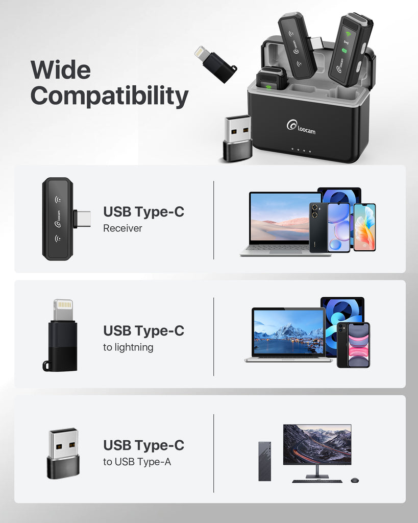 - Plug and Play, Automatic Pairing: No app required, pairs in just a second. Simply insert the Type-C receiver into your phone, tablet or PC, turn on the microphone, and it will pair automatically. Clip the wireless microphone to your collar, and you're ready to record anywhere, anytime. No fuss, no muss. Lightning-fast connectivity means more time recording and less time tech-tangling. Works for creators to pick up sounds via YouTube, TikTok, Instagram, Facebook.