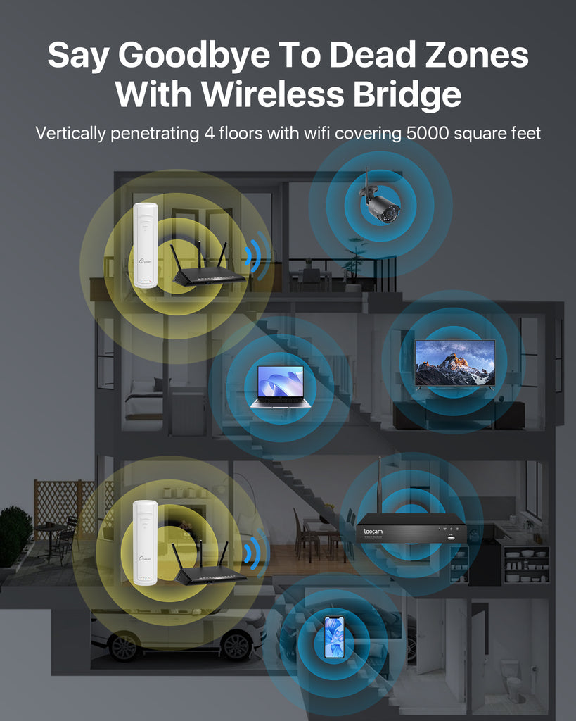 - Connectivity for All Your Devices: The Wi-Fi bridge supports up to 8 devices, whether it's your smartphone, tablet, laptop, TV, or other smart devices, experience seamless compatibility. Additionally, you can also extend your video surveillance signal for enhanced security coverage.