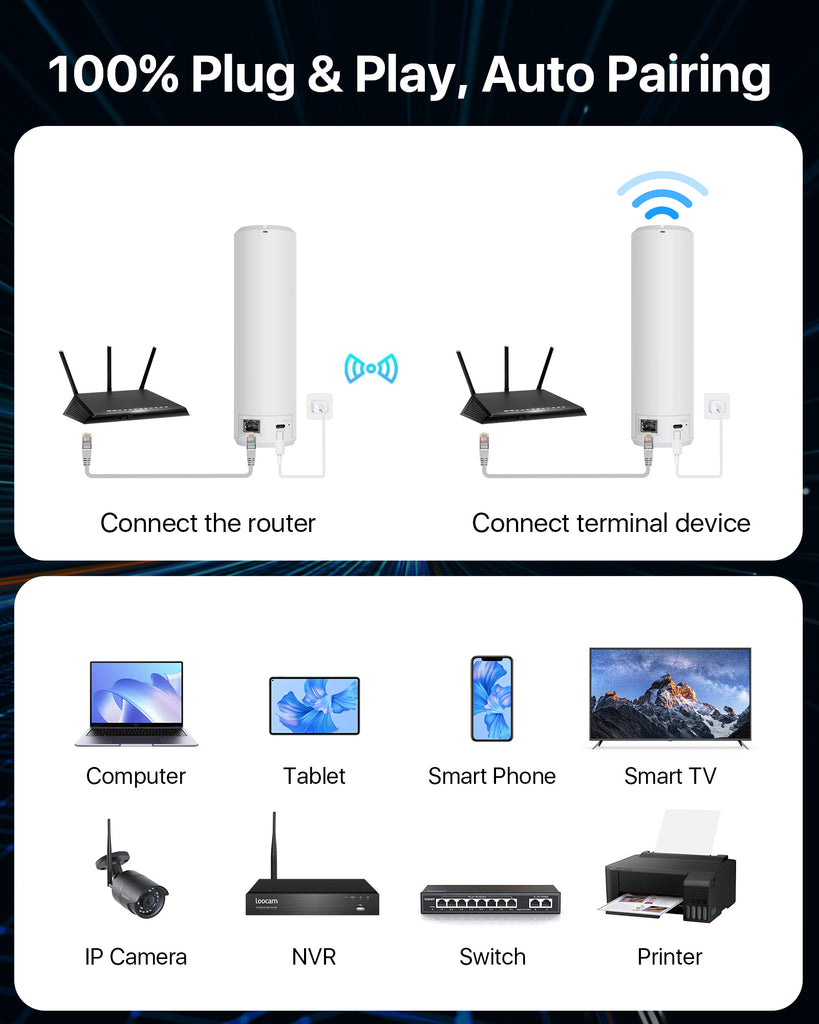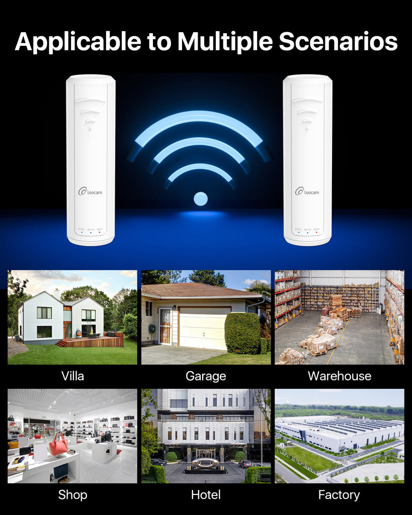 - No Wiring Required, Enhanced Security: By connecting one of the wireless bridges to a IP camera and the other to a computer, remote monitoring can be realized without long distance wiring. Safeguard your network from unauthorized access with advanced encryption protocols, keeping your personal data and online activities protected at all times.